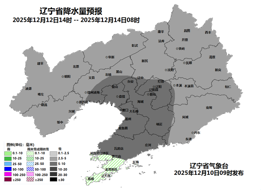 12日12时至14日8时,大连北部、鞍山、锦州中东部、营口、辽阳、盘锦区域有大雪(降雪量5~8毫米),大连南部区域有雨夹雪转中雪(降雪量2.5~5毫米),其他当地有中雪(降雪量2.5~5毫米)。